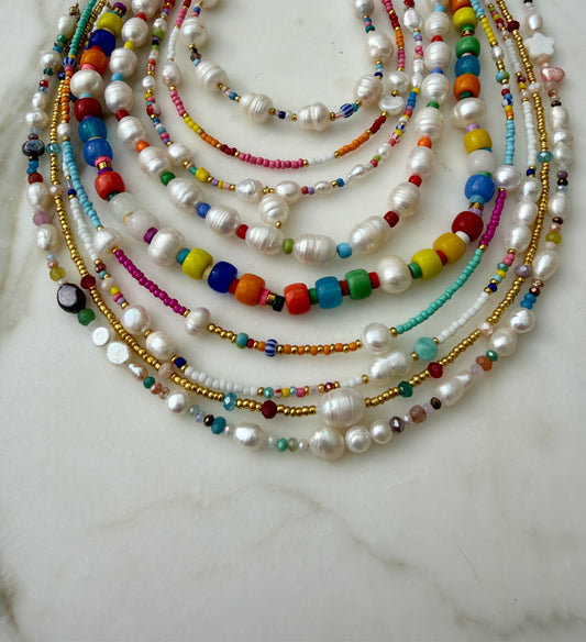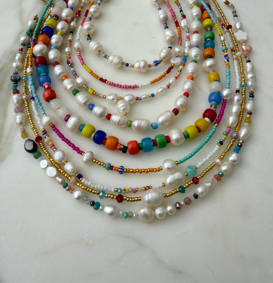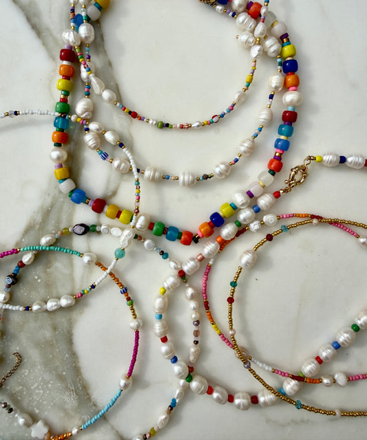 Timeless with a coastal soul, our pearl necklaces are hand-strung using real freshwater pearls, each chosen for its natural beauty and individuality. Designed to be worn your way, these pieces layer effortlessly with your favourite charm necklaces or shine beautifully on their own. Subtle variations in shape, size, and lustre make every necklace one of a kind — relaxed, refined, and made to be worn, loved, and lived in.