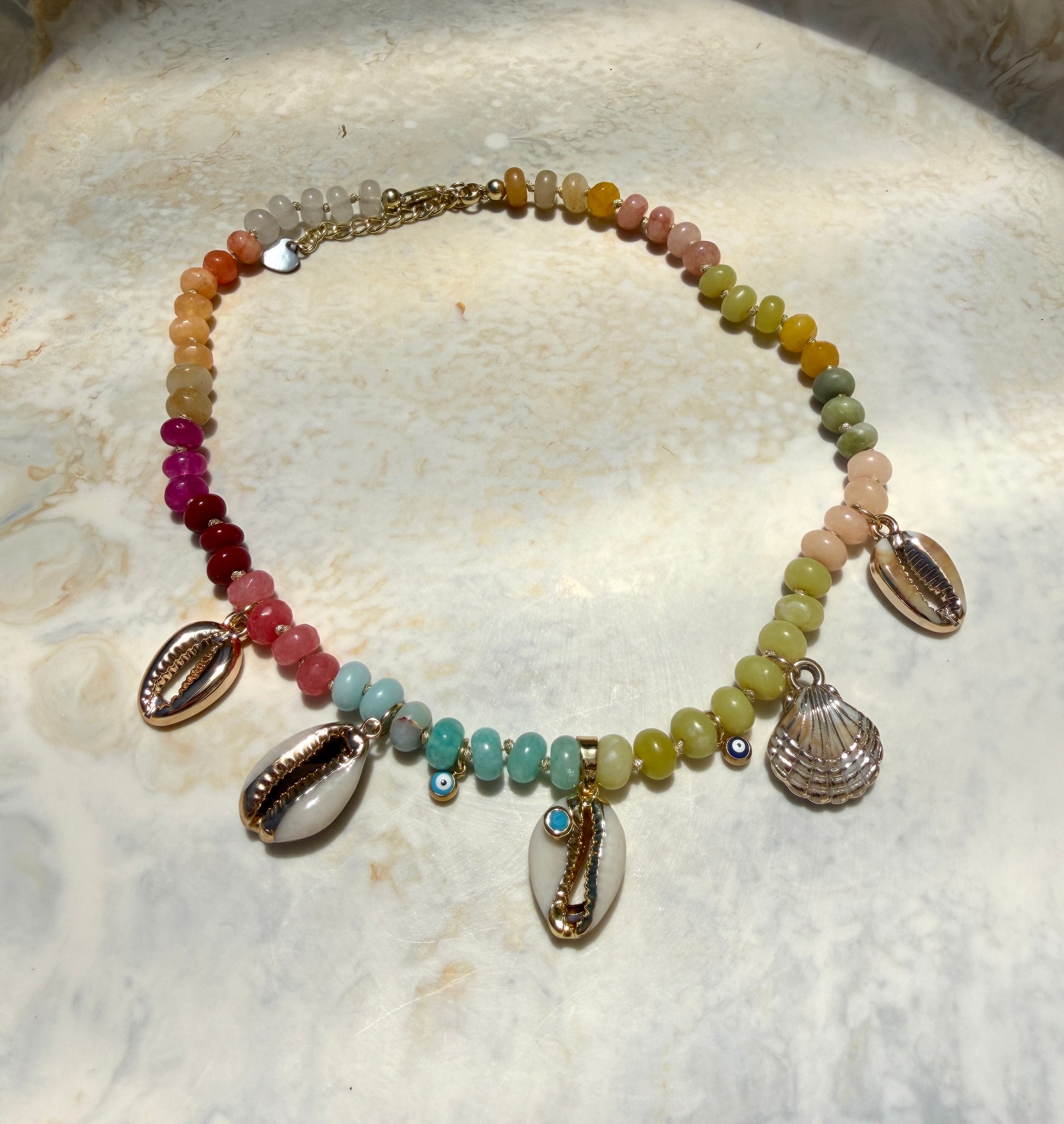 Handmade in our Melbourne studio from rainbow hand-strung beads, each piece is completely unique. Adorned with seven luxe charms: evil eyes, four cowrie shells, and a shell charm. Delicate wear—treat with care, do not get wet or drop. Approx. 16–17” length with lobster clasp and chain extension. A charming statement piece that brings seaside vibes everywhere you go.