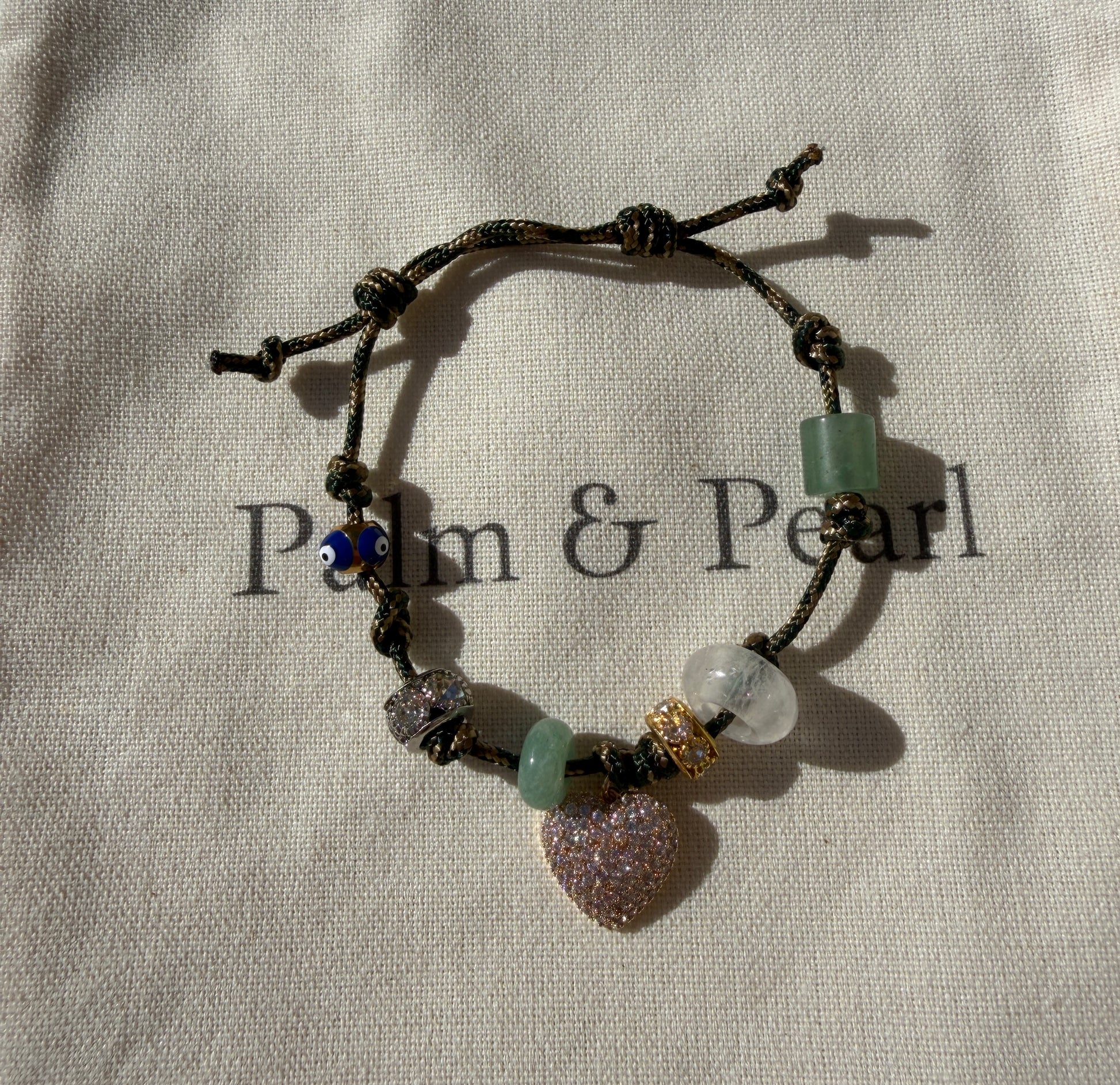 Handmade in our Melbourne studio. Fully adjustable with sliding knots. Made from neutral khaki paracord featuring our signature diamanté heart charm, an evil eye bead, luxe diamanté and agate beads.