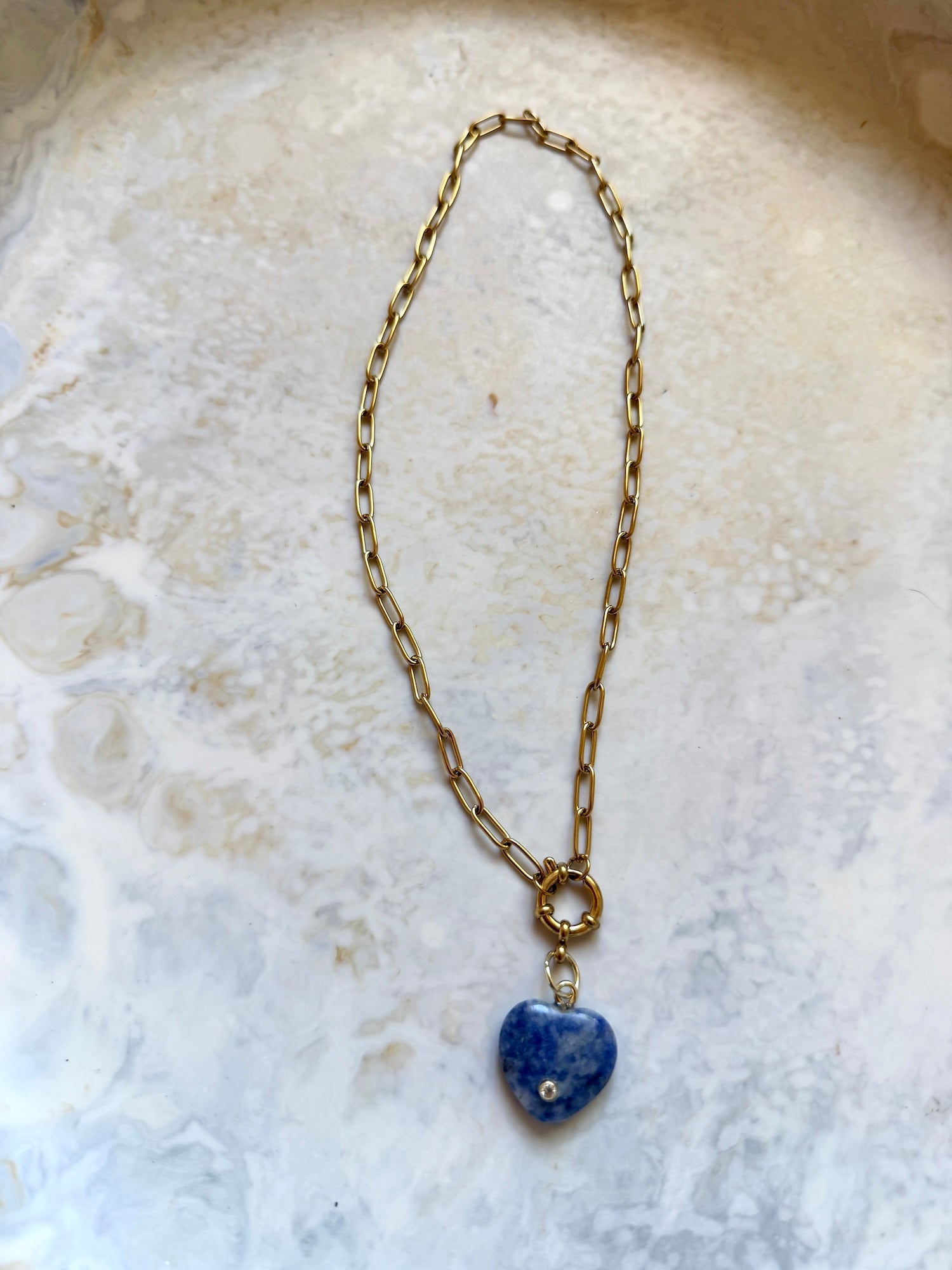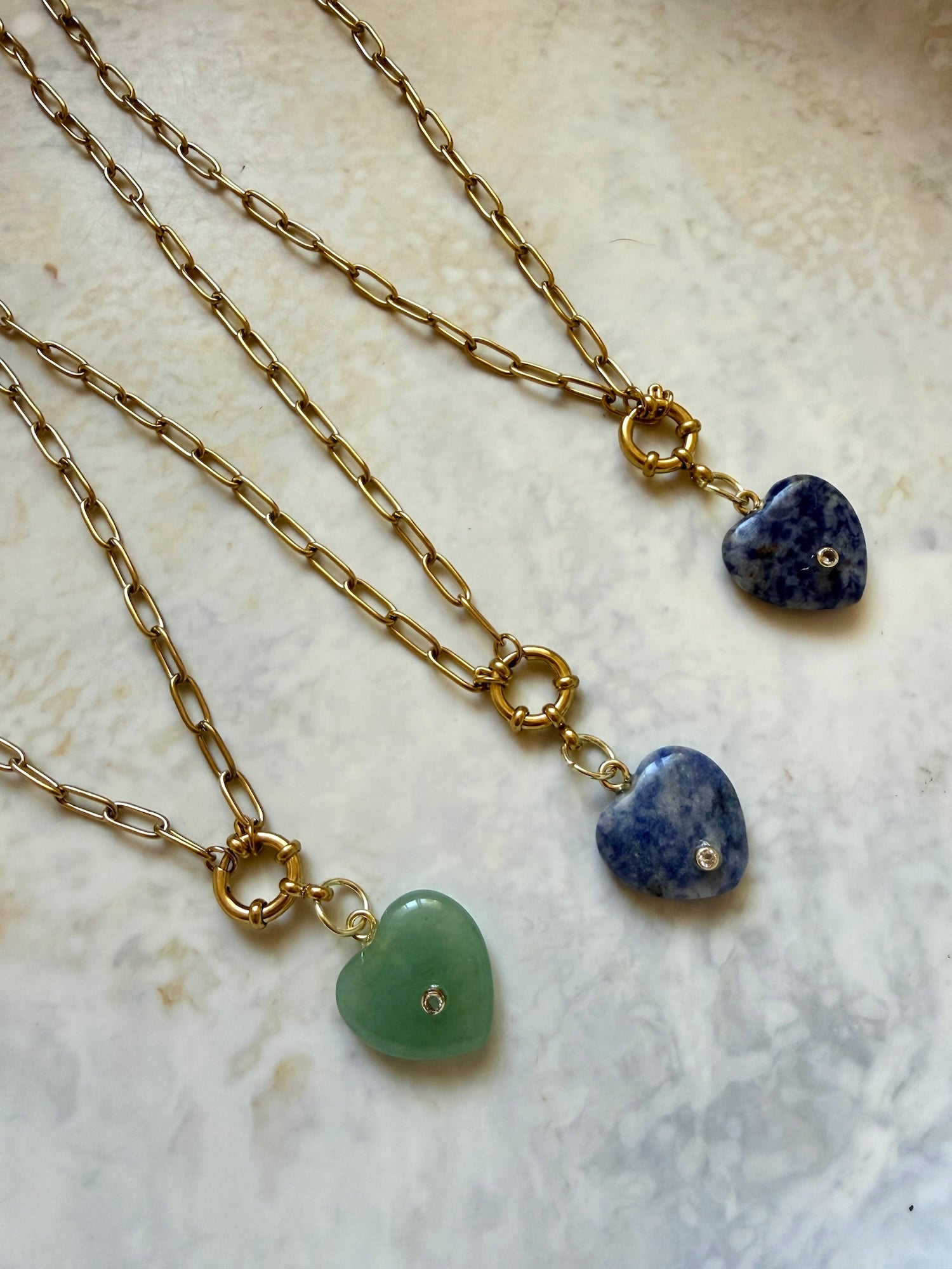 The Amour Necklace features a green agate heart pendant, finished with a single diamanté for subtle sparkle. Set on a gold-toned paperclip chain and crafted from gold-toned stainless steel, this piece sits at approximately 40cm in length.