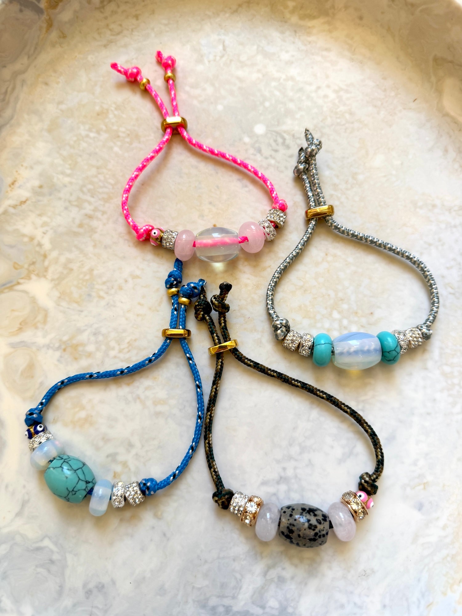 Handmade in our Melbourne studio and fully adjustable with a golden toggle. Available in four cord colours, each one unique. Featuring 6–7 luxe beads, including a statement agate centrepiece, diamanté slider beads, agate stones and our signature evil eye bead. Designed for stacking or shining solo.