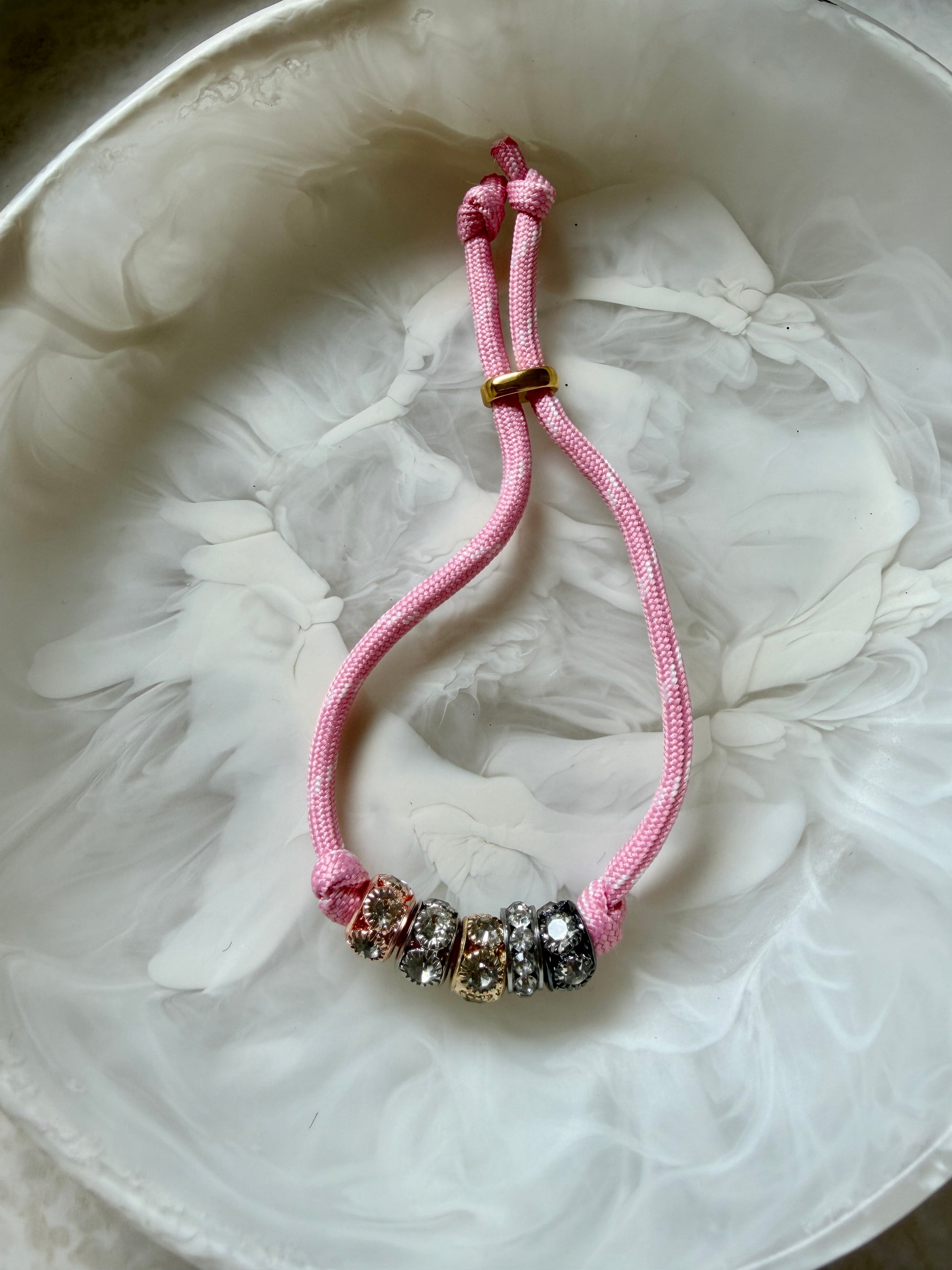 Handmade in our Melbourne studio, fully adjustable with a golden toggle. Baby pink paracord features five luxe diamanté beads for a clean, elegant finish.