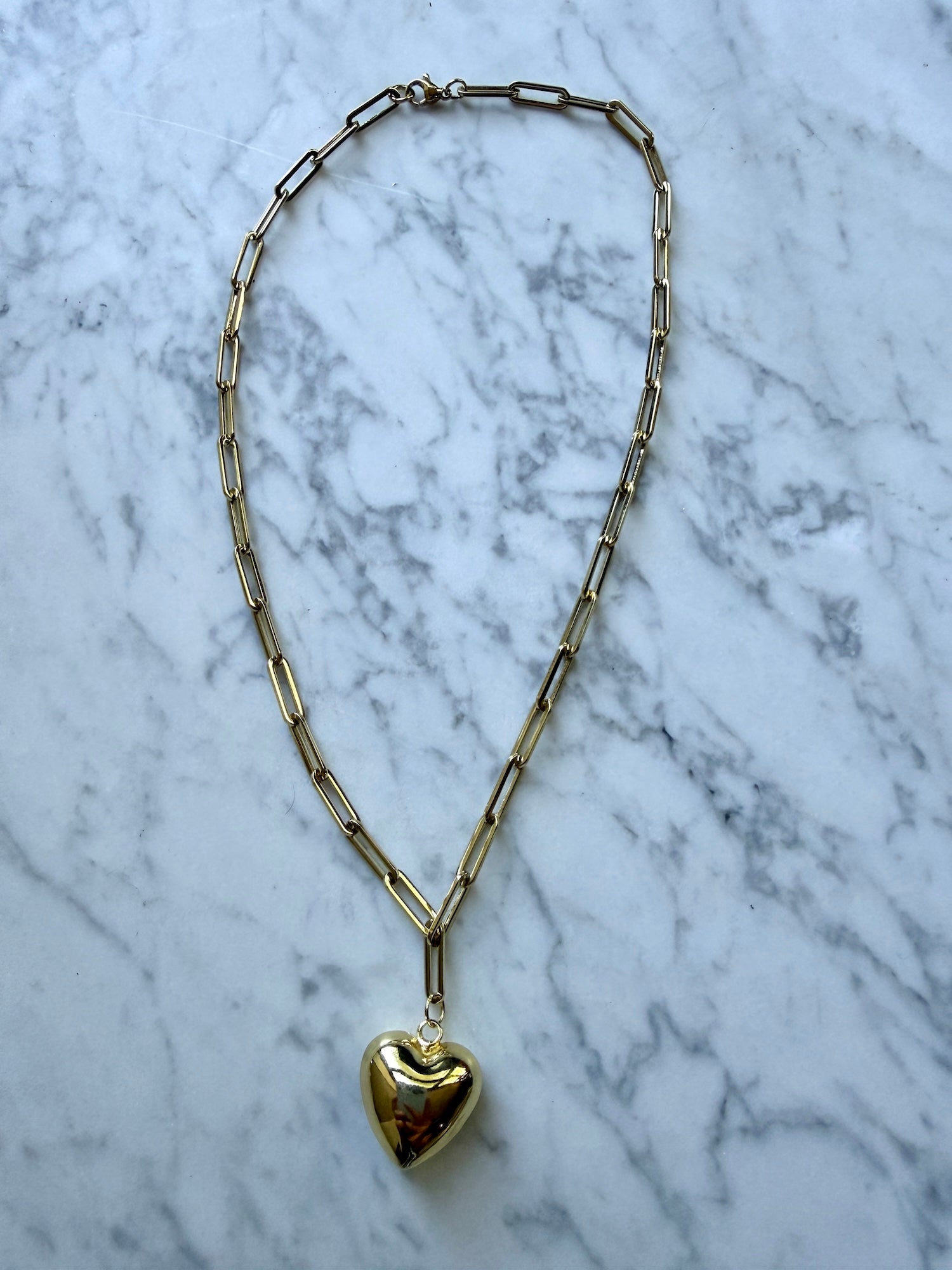 The Ever After Heart Necklace features an golden bubble heart pendant suspended from a delicate gold-toned paperclip chain.