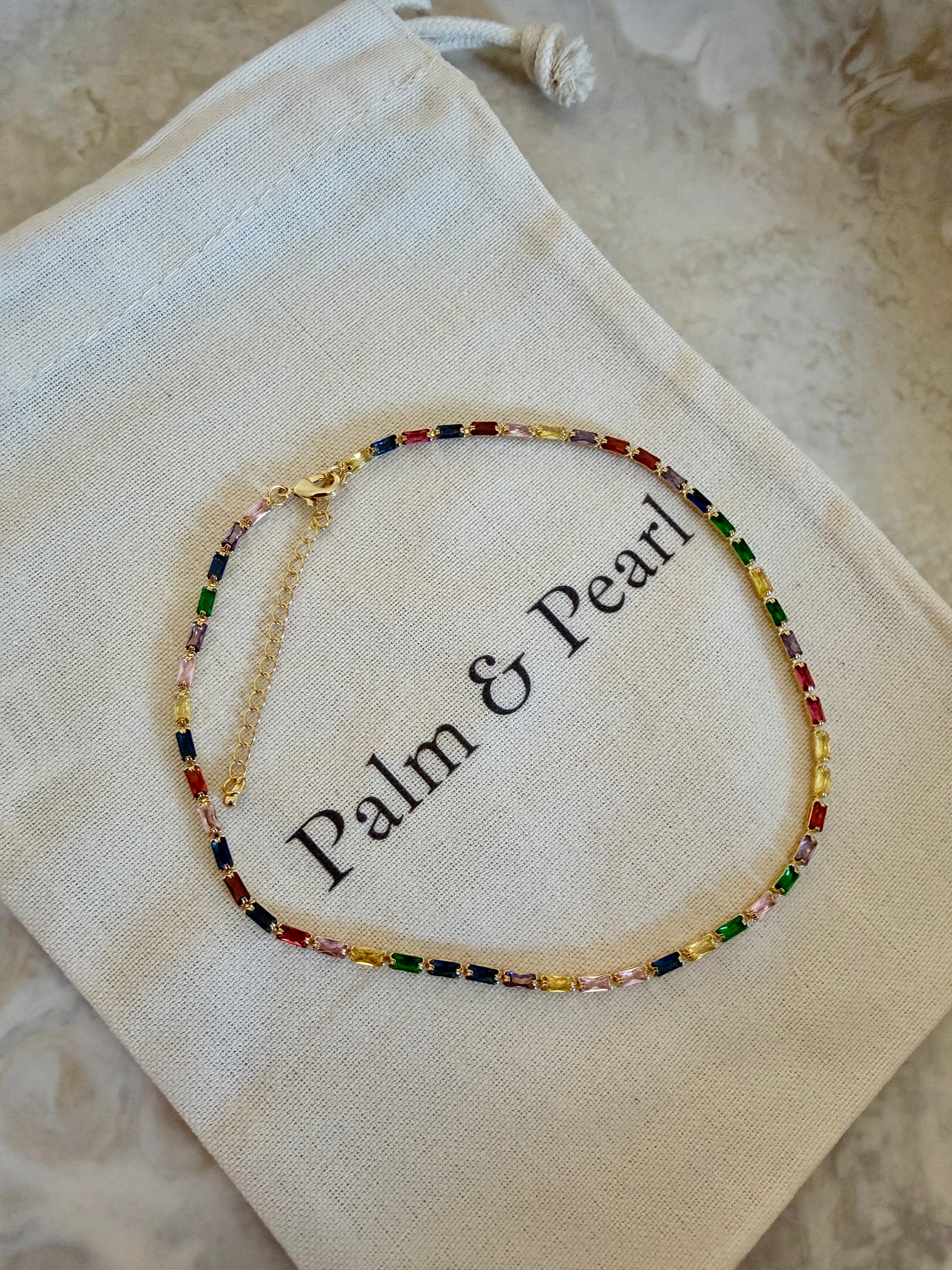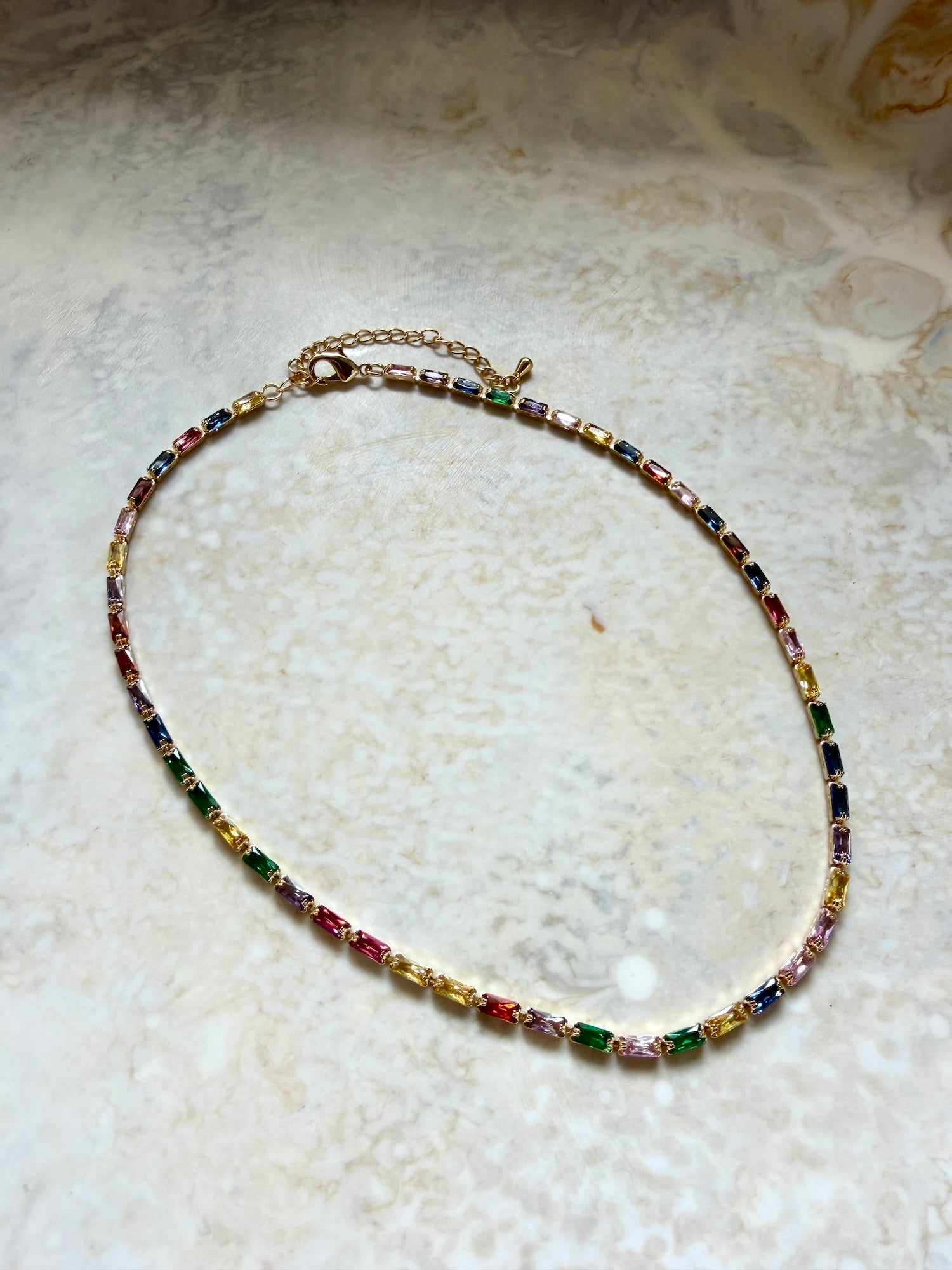 A gold rainbow rectangle crystal tennis necklace featuring radiant cubic zirconia stones that bring instant shine to any look. Easy to wear, impossible to ignore.