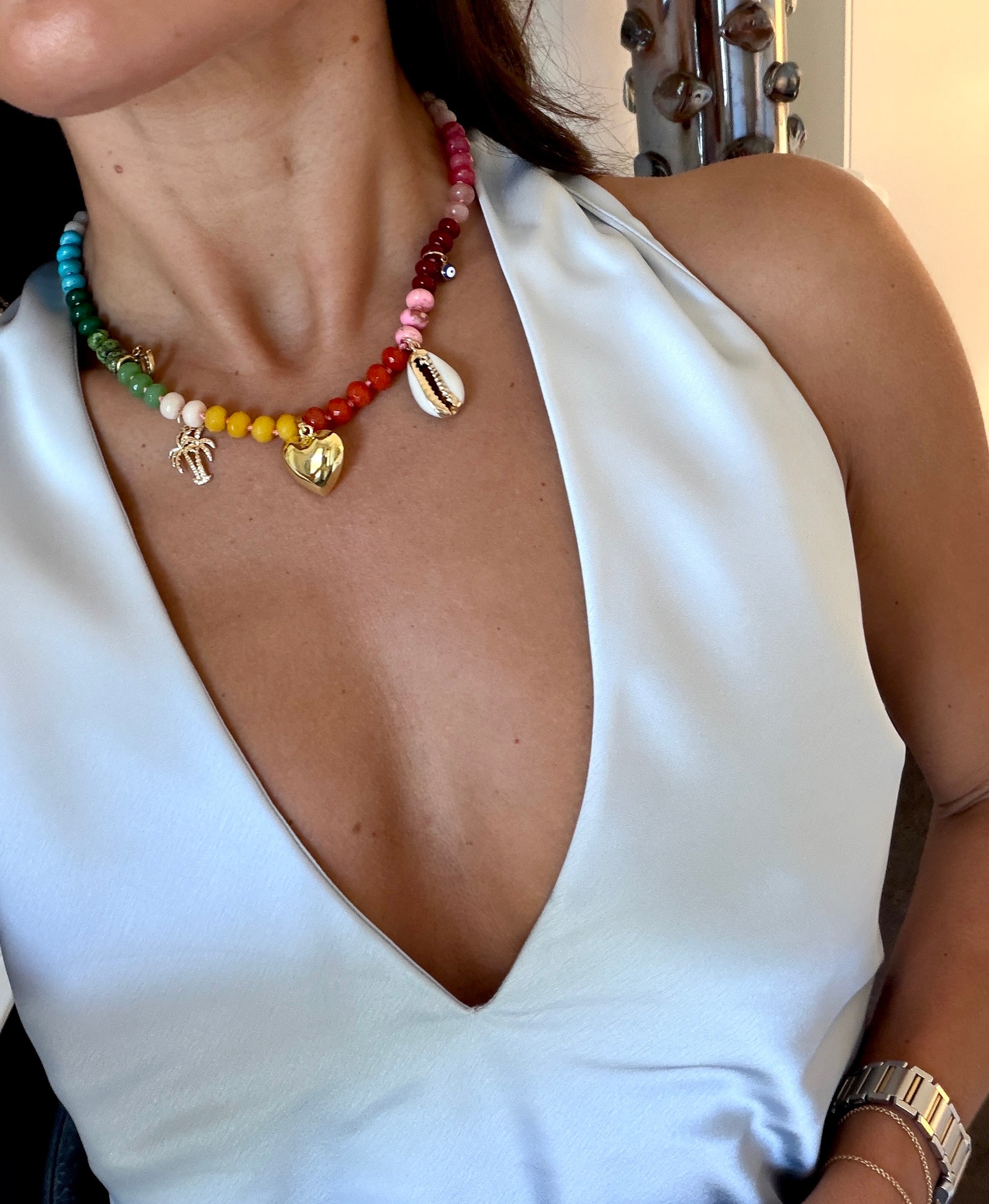 Handmade in our Melbourne studio from rainbow hand-strung beads, each piece is uniquely crafted. Adorned with five luxe charms: evil eye charm, cowrie shell, gold bubble heart, our signature palm tree charm, and a golden diamanté horseshoe. Delicate wear—treat with care, do not get wet or drop. Approx. 16–17” length with lobster clasp and chain extension. Tropical vibes and luxe sparkle, perfect for everyday layering.