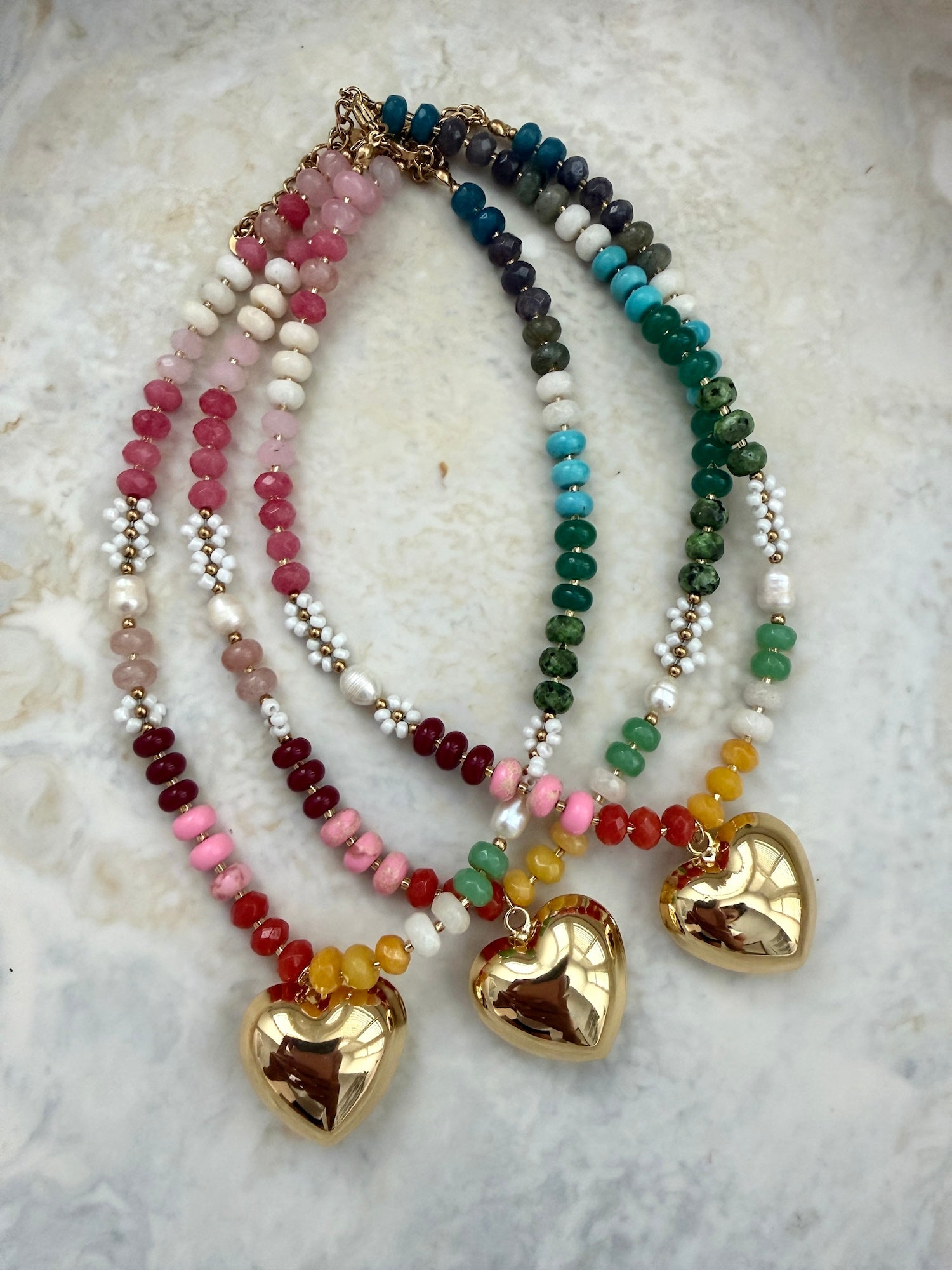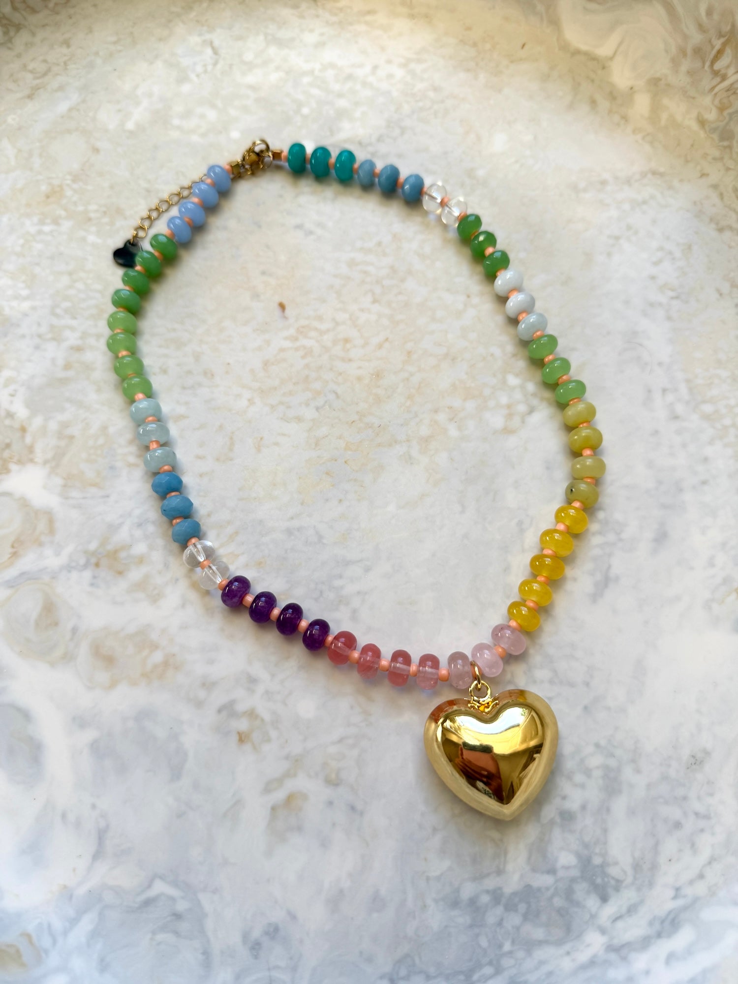 Hand-charmed in our Melbourne studio from hand-strung glass beads. Adorned with a luxe oversized gold bubble heart pendant and available in three bead colours. Wear solo or layer with your favourite pearl or tennis necklace.