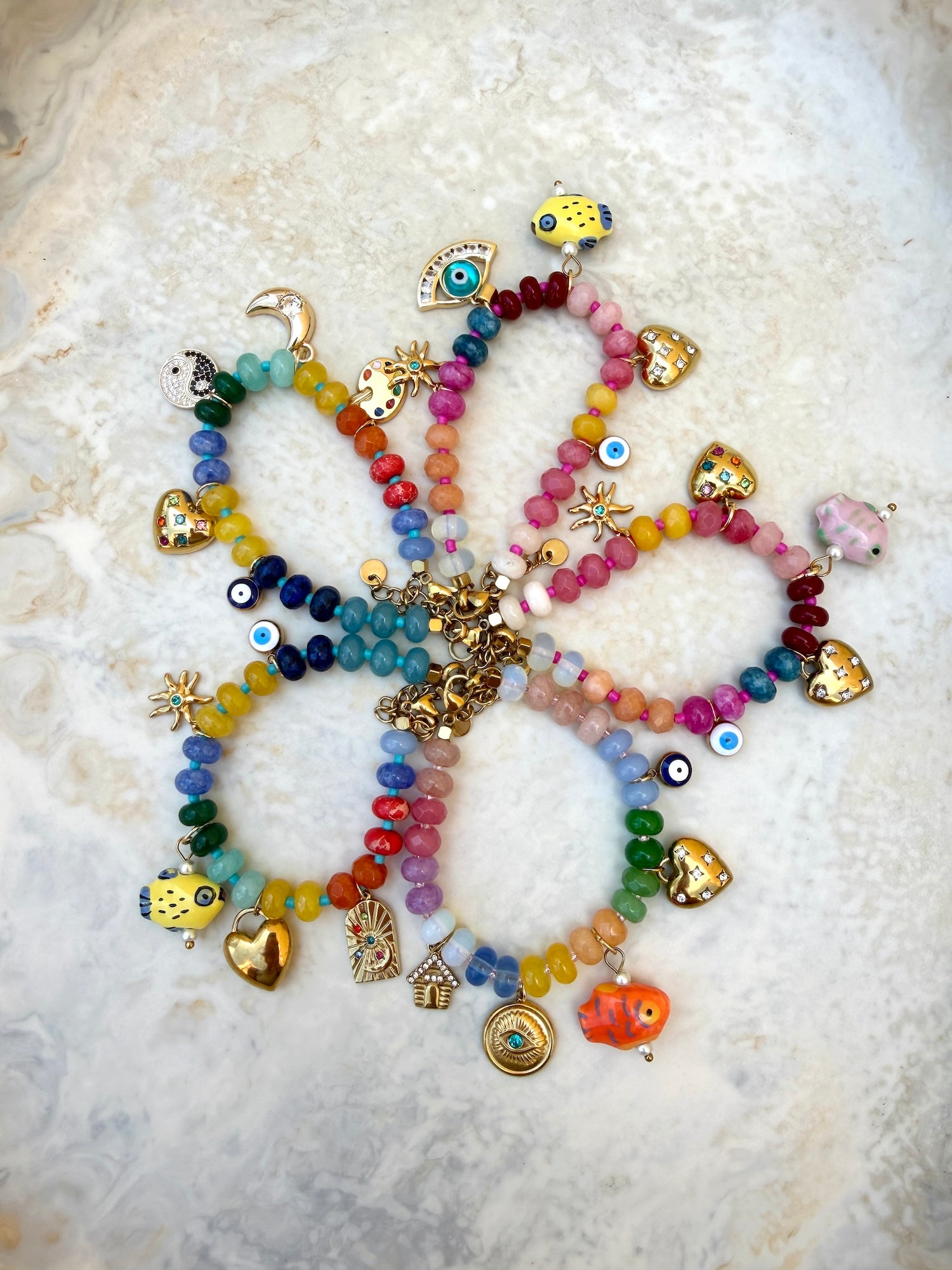 Handmade in our Melbourne studio from rainbow hand-strung beads, the Marigold Charm Bracelet is completely unique. Featuring luxe charms including evil eyes, sun, ceramic fish, and heart. Finished with a clasp and chain extension.