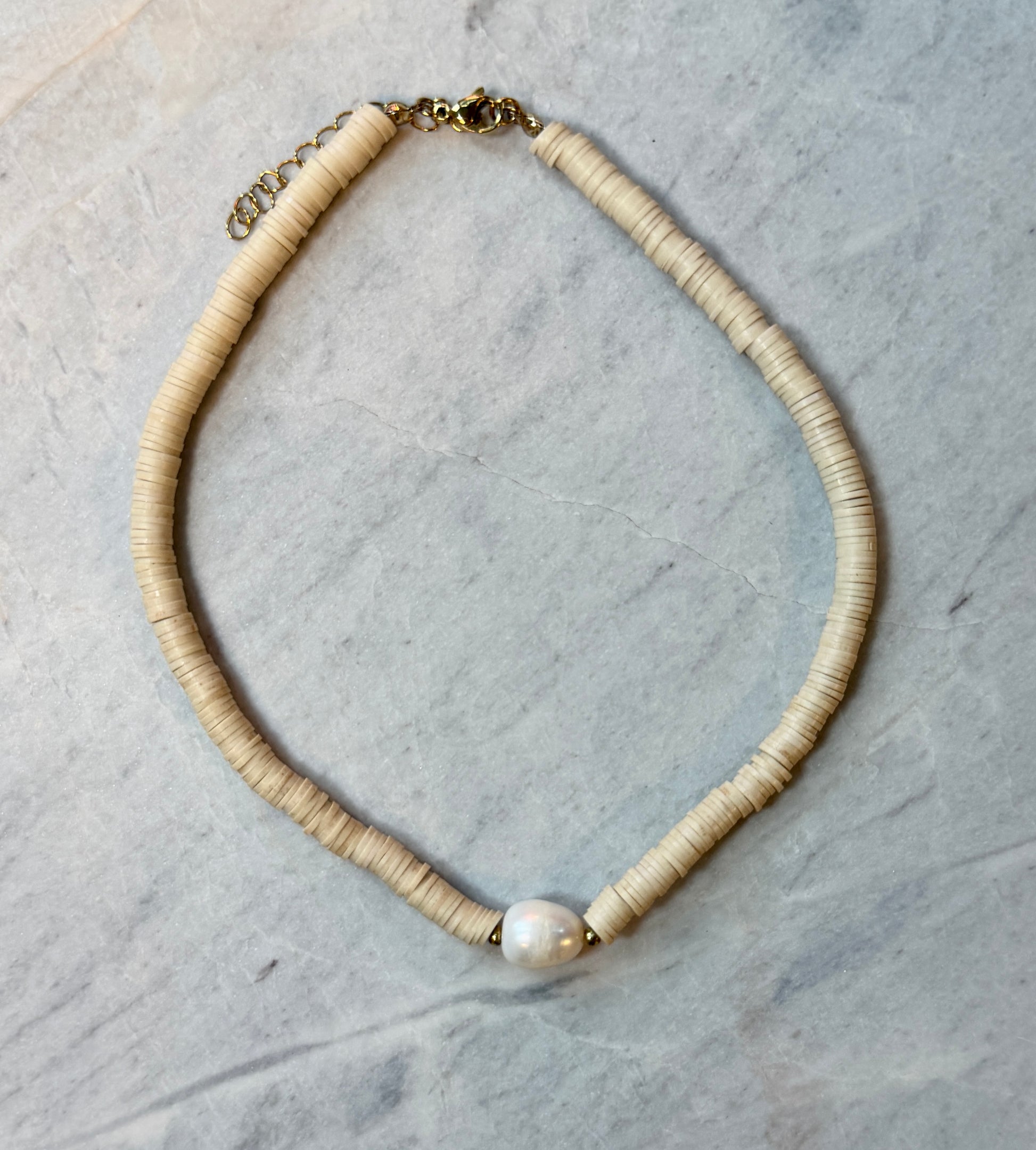 The Noosa necklace is all about easy-breezy charm. A single glowing freshwater pearl sits front and centre, paired with warm beige clay beads for that relaxed, sun-kissed feel. Perfect for layering or wearing solo.