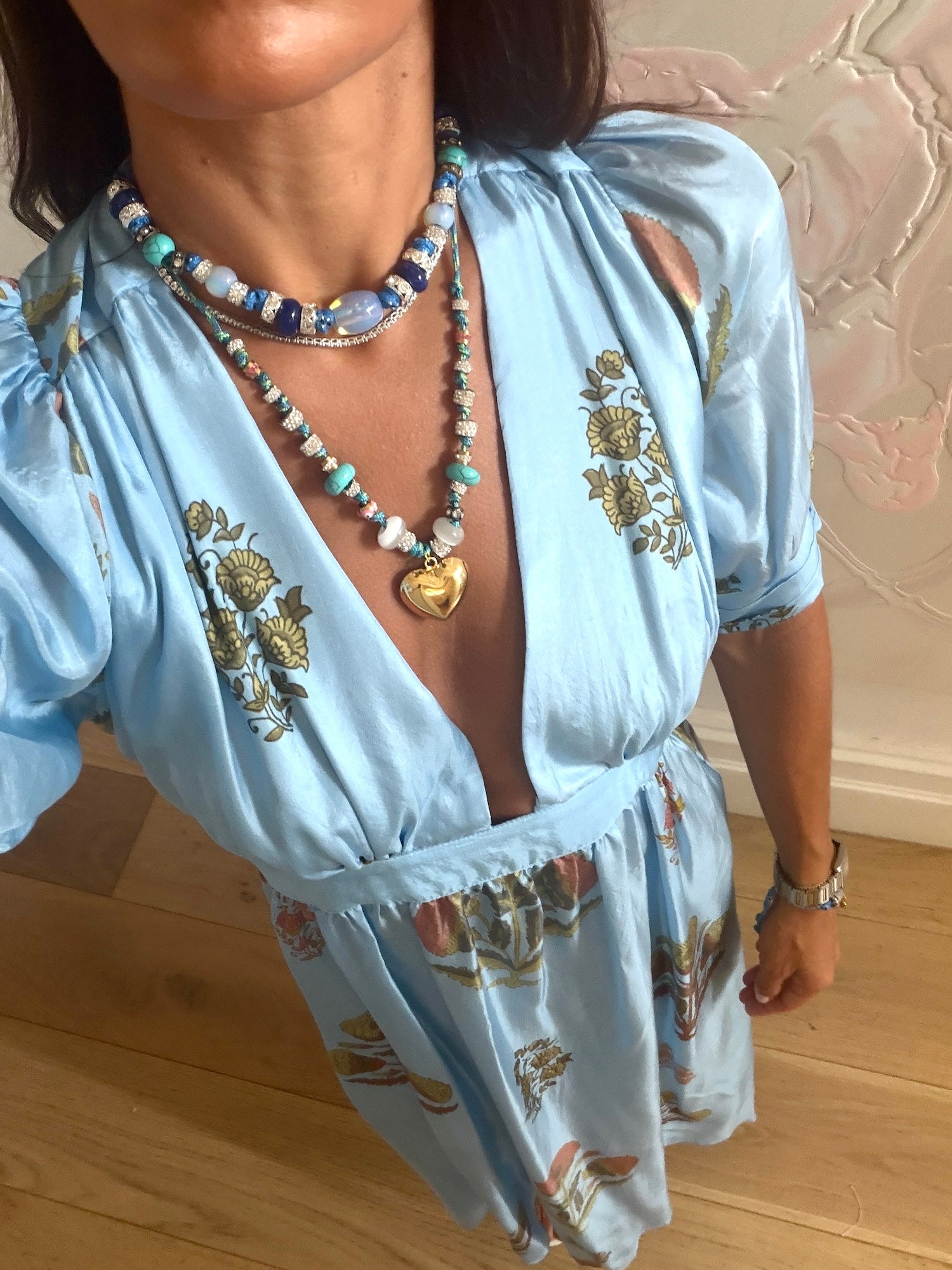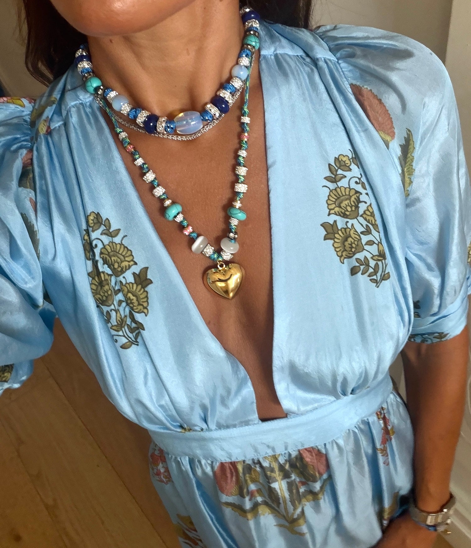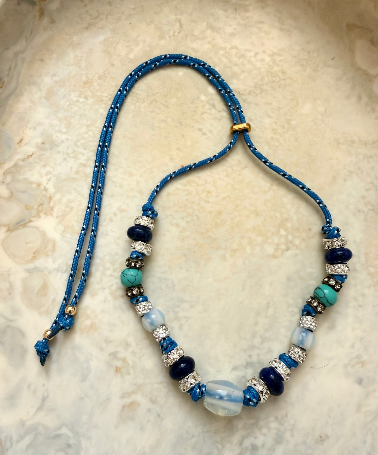 Handmade in our Melbourne studio from blue paracord, adjustable with a sliding toggle. Featuring a opal color agate stone centrepiece, finished with diamanté, agate and metal beads. Calm, vibrant and beach-born. Wear long or short.