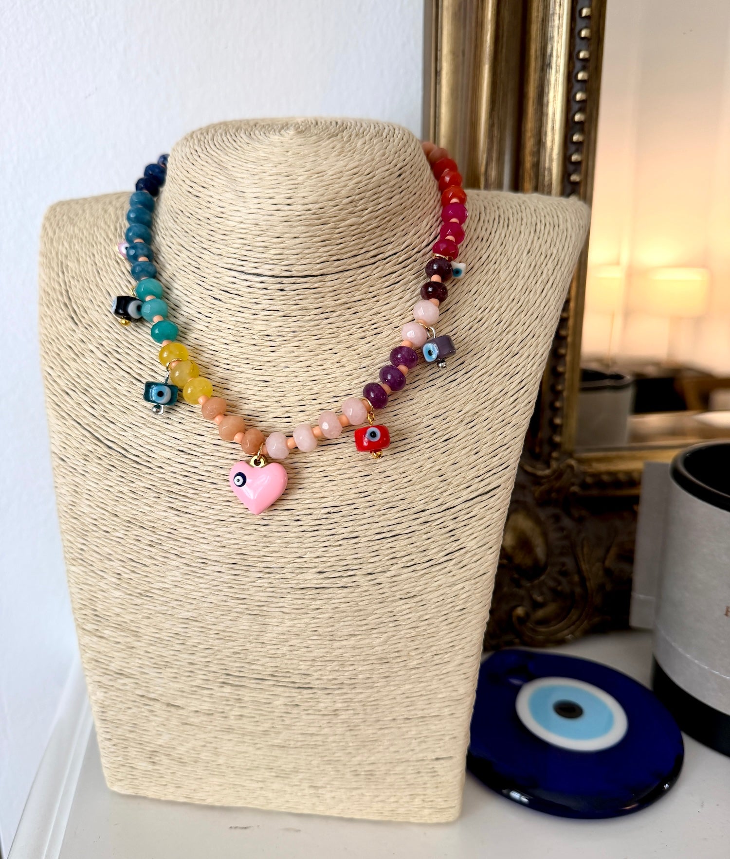Pendants: pink enamel love heart evil eye, multi-coloured glass evil eyes, golden metallic evil eyes