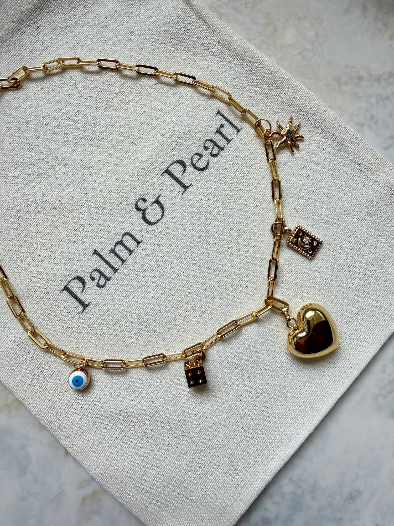 The Seabreeze Charm Necklace features a gold-toned stainless steel paperclip chain adorned with five luxe charms, including a large golden bubble heart and dog tag sun and evil eye charms. Approx. 40cm.