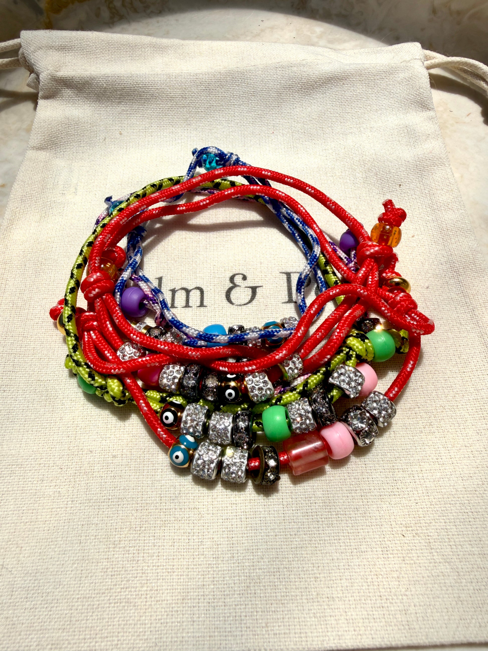 Handmade in our Melbourne studio from red paracord, adorned with luxe diamanté beads for extra sparkle, pink acrylic beads, a red agate bead, and a protective evil eye charm. Fully adjustable with double sliding knots.