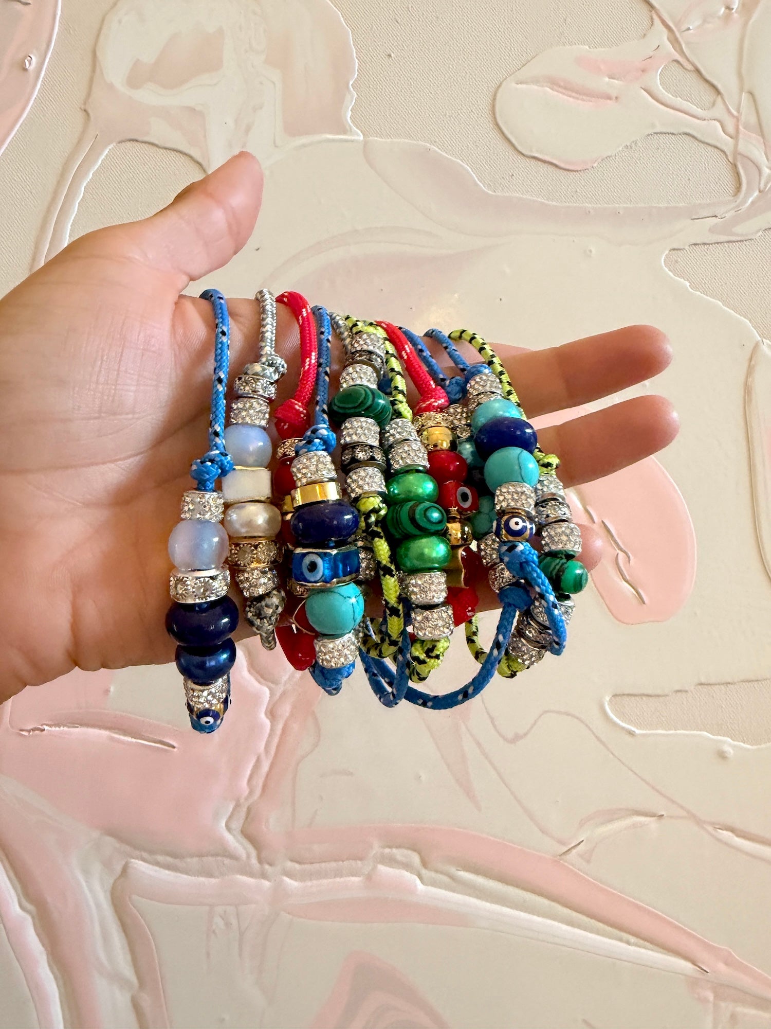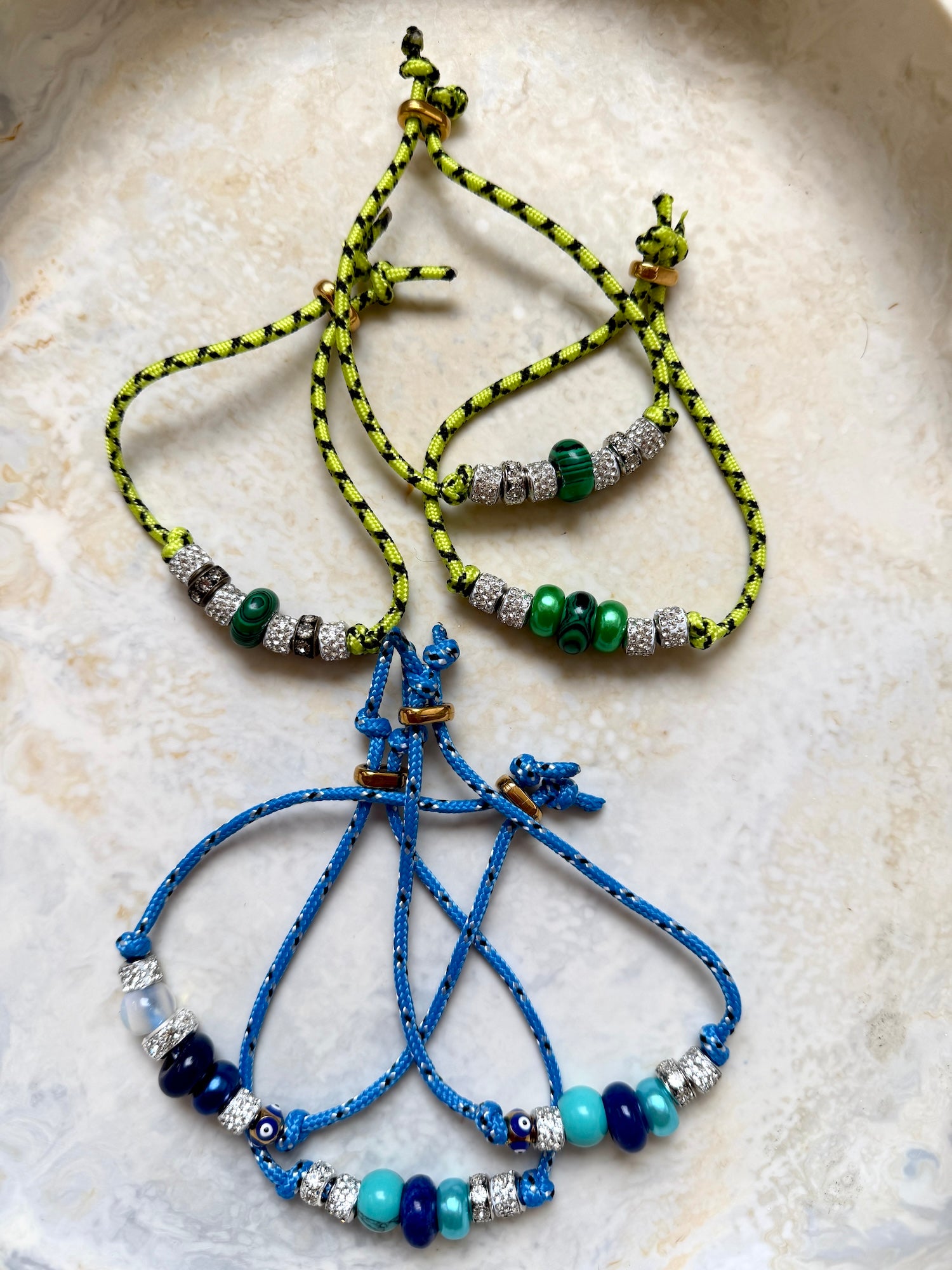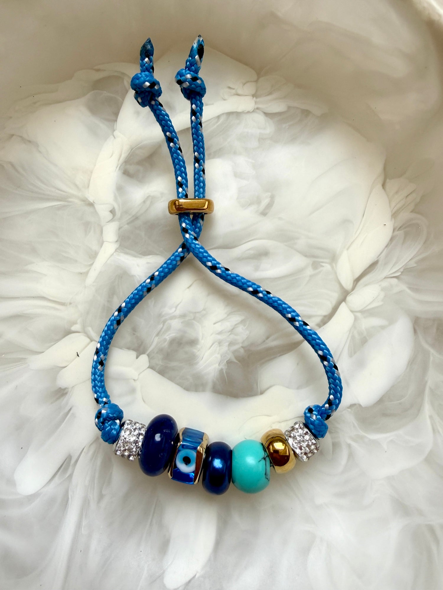 Featuring a curated mix of agate, malachite, glass, diamanté, evil eye and metal beads, this piece blends subtle sparkle with symbolic charm. Finished with an adjustable golden toggle, it’s made to fit comfortably and move with you.
