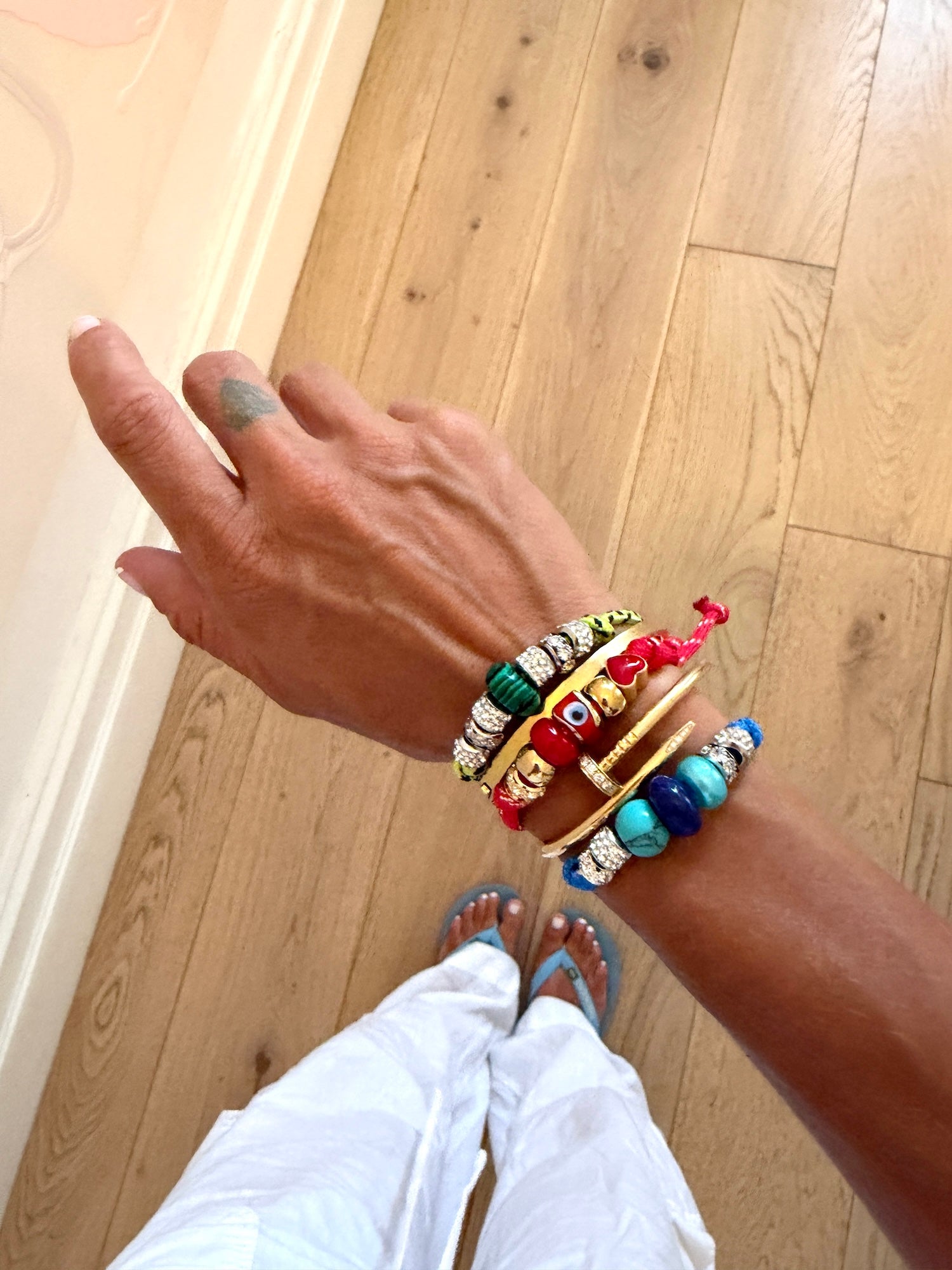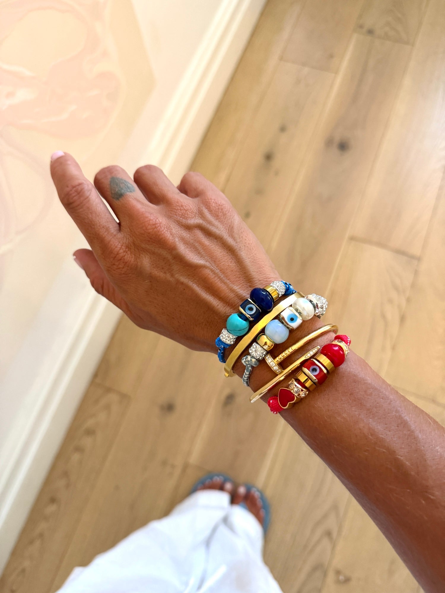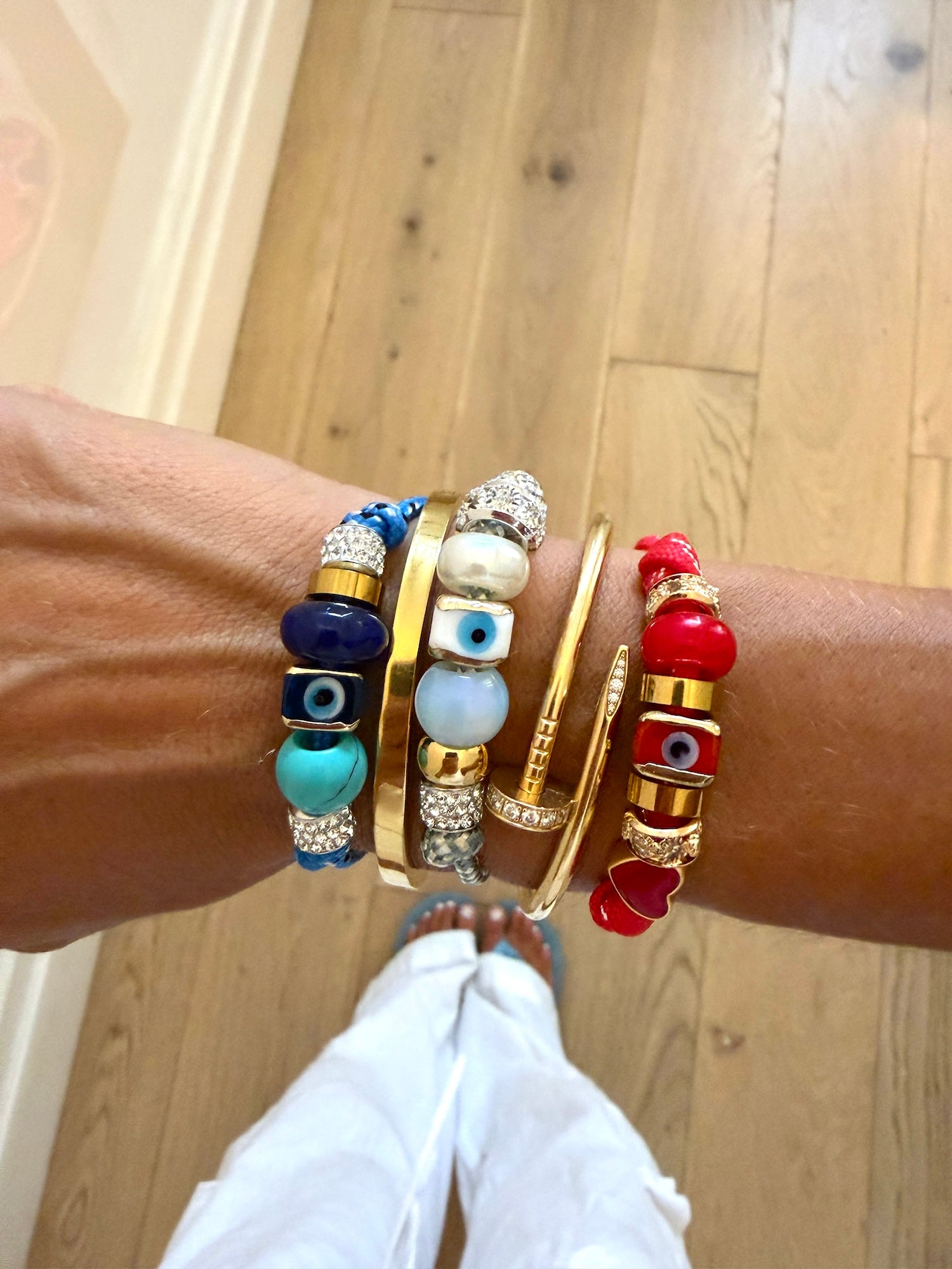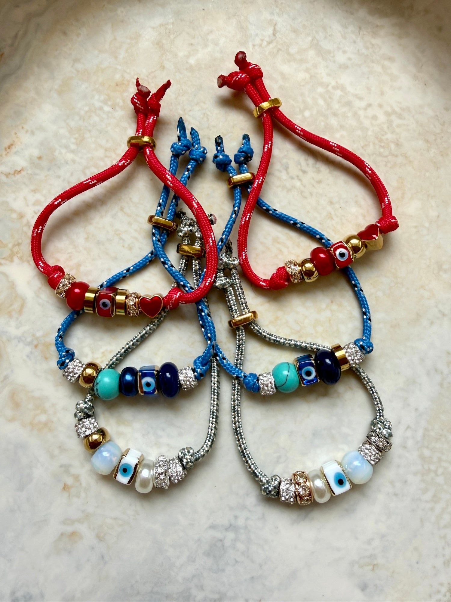 Featuring a curated mix of agate, malachite, glass, diamanté, evil eye and metal beads, this piece blends subtle sparkle with symbolic charm. Finished with an adjustable golden toggle, it’s made to fit comfortably and move with you.