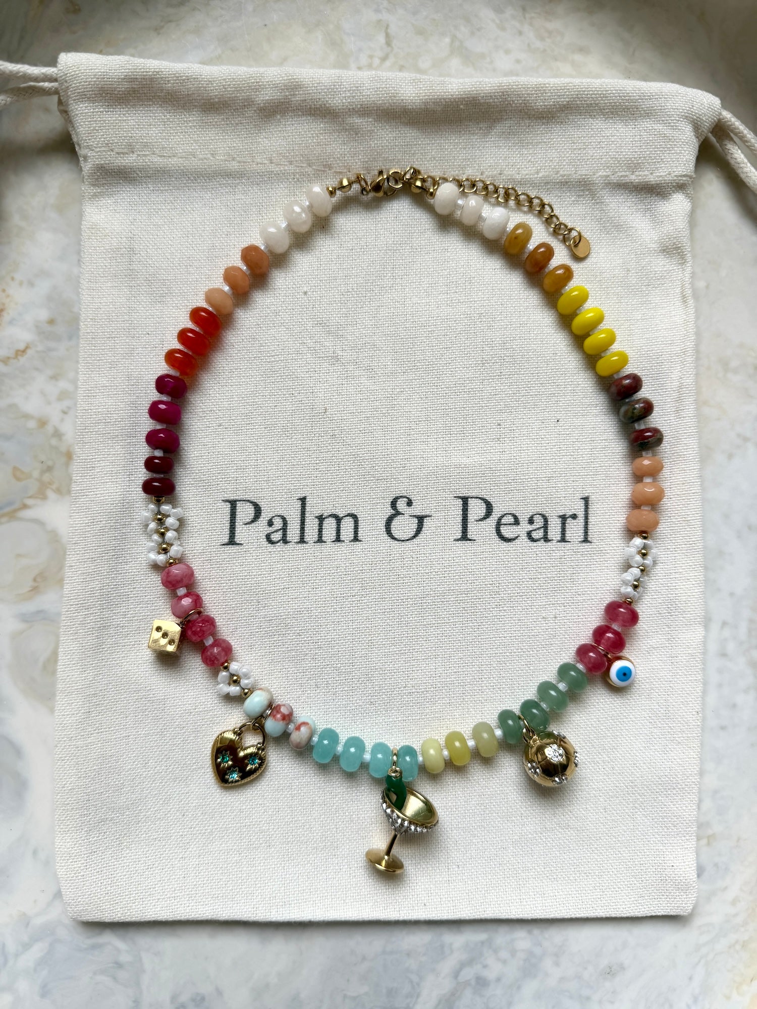Handmade in our Melbourne studio from rainbow hand-strung beads, each Sueño Charm Necklace is completely unique. Featuring five luxe charms and a lobster clasp with chain extension, approx. 16–17” in length.