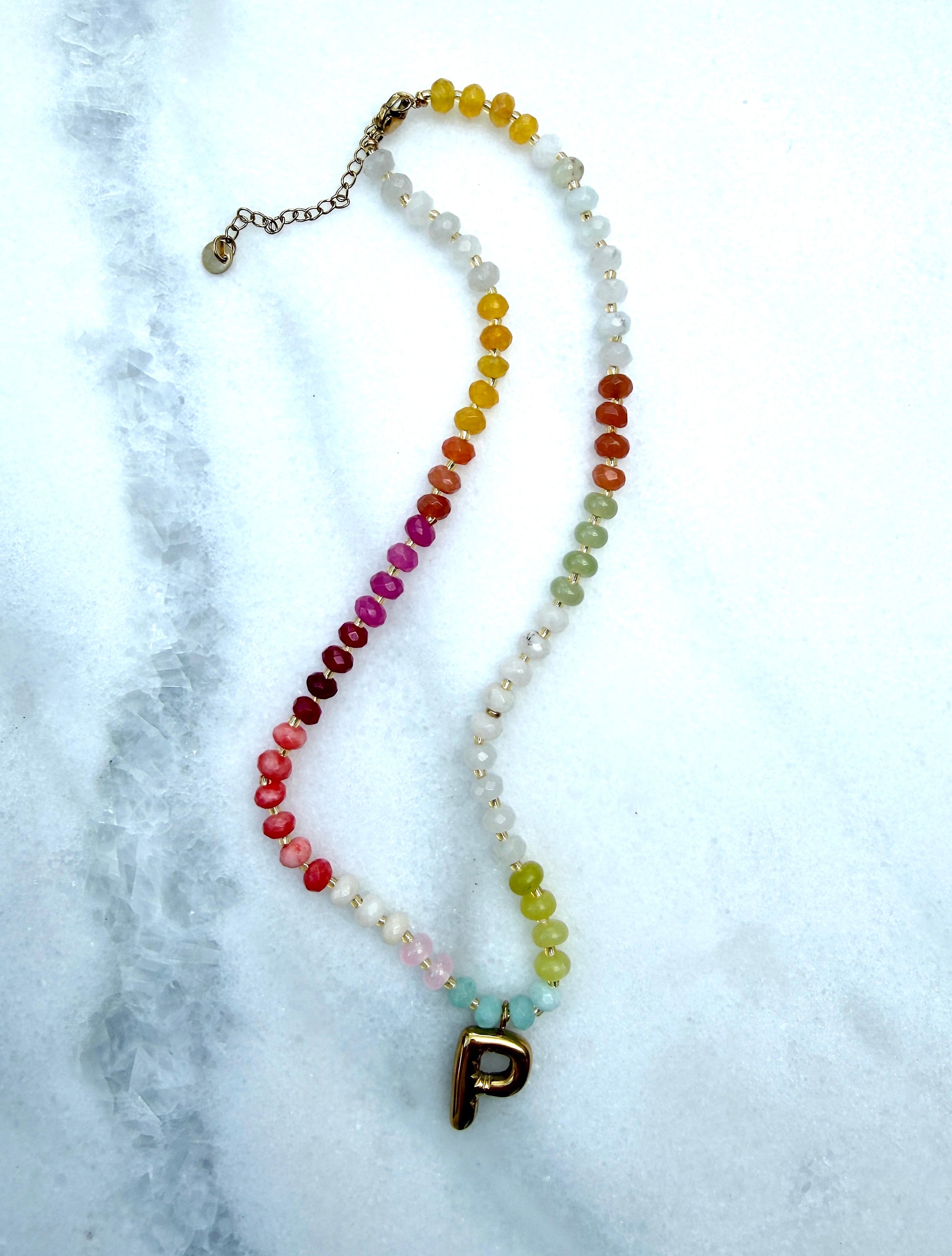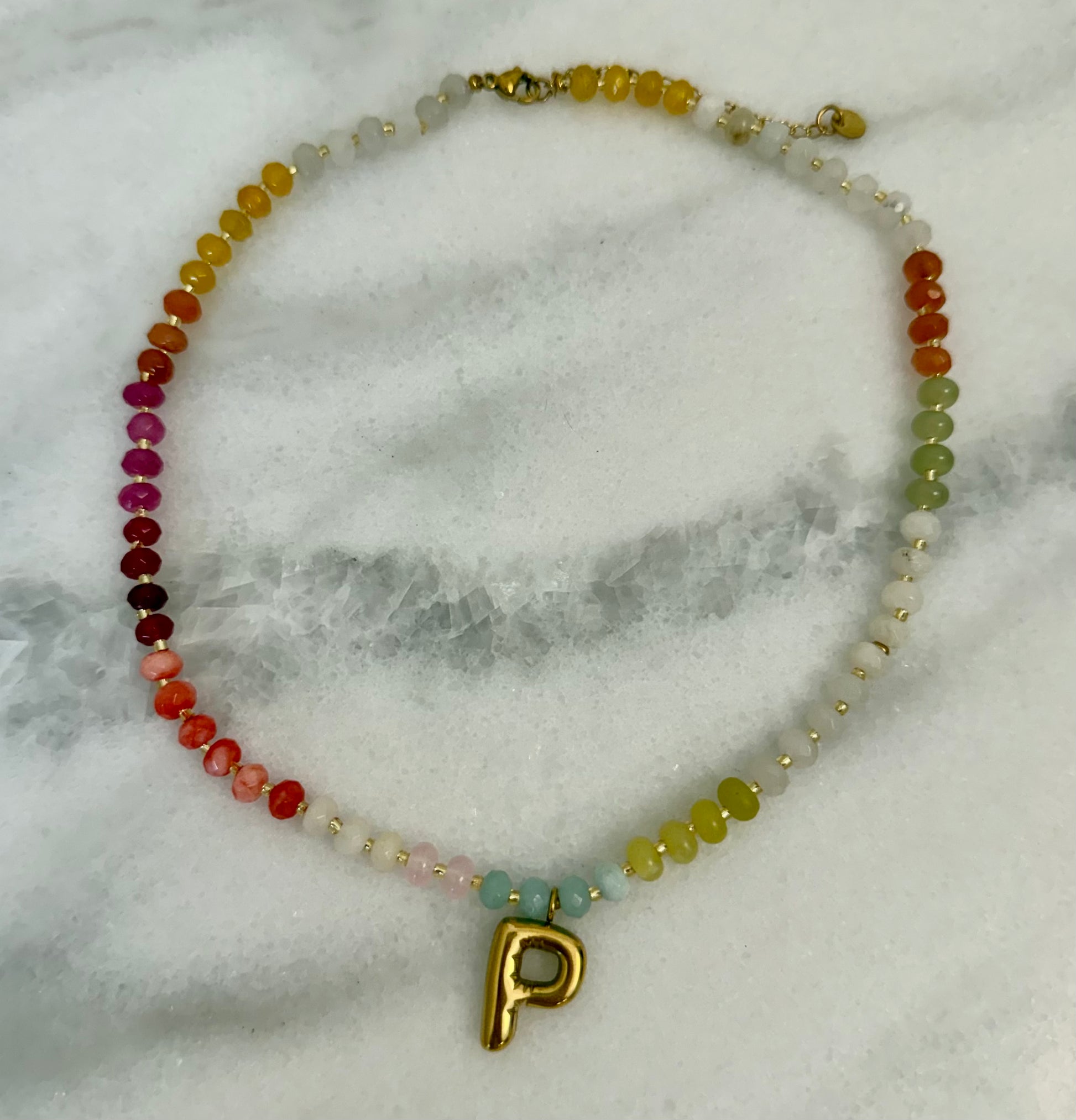 The Sun Tide Initial Necklace is a beautiful initial necklace designed to lift the spirit of every outfit. An essential accessory in every wardrobe. Taking you from day to night this stunning piece can be worn against fine jewellery or on its own. Made with natural stones and a gold plated initial. The perfect personalised gift.