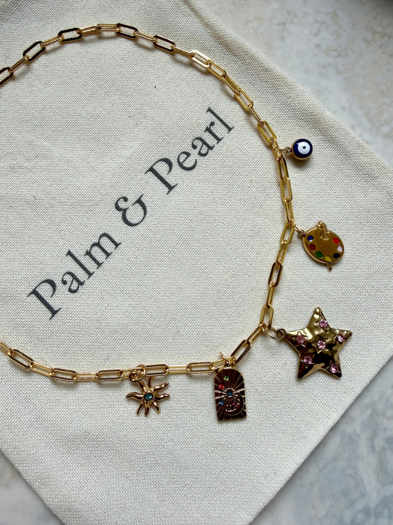 The Sunrise Charm Necklace is crafted on a gold-toned stainless steel paperclip chain, measuring approximately 40cm. Featuring five luxe charms including a star, dog tag, paint palette, sun, and evil eye.