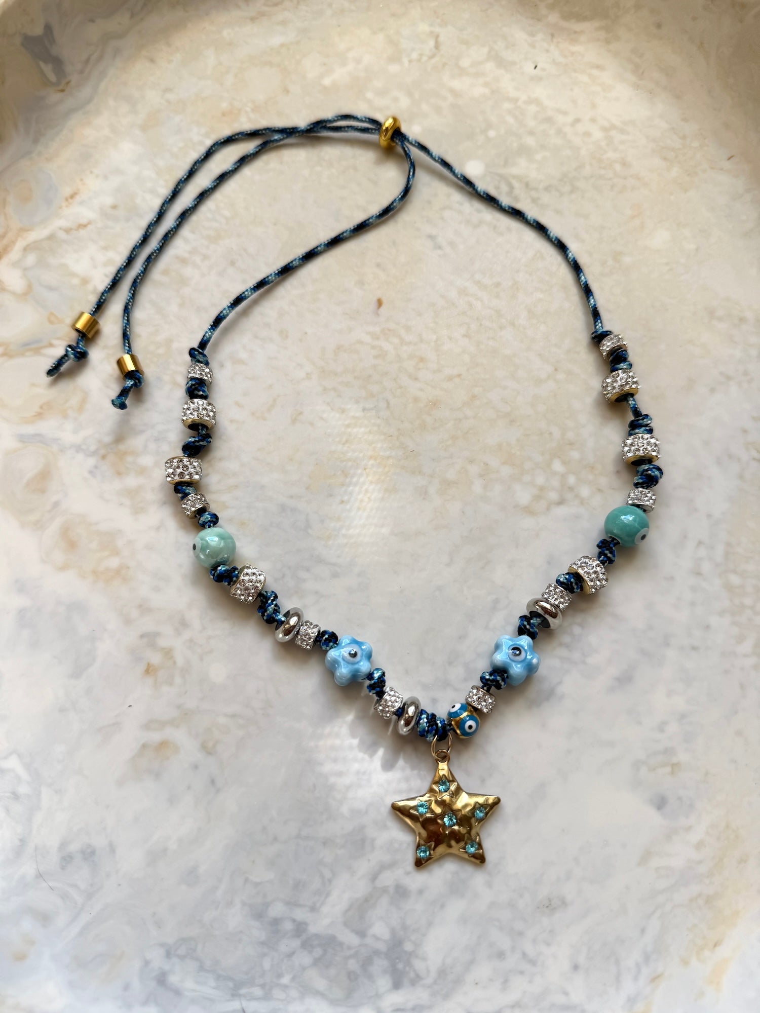 Handmade in our Melbourne studio from blue paracord, adjustable with a sliding toggle. Featuring a luxe diamanté star pendant, finished with diamanté, ceramic evil eye and metal beads. Easy, radiant, and designed to shine from day to night.