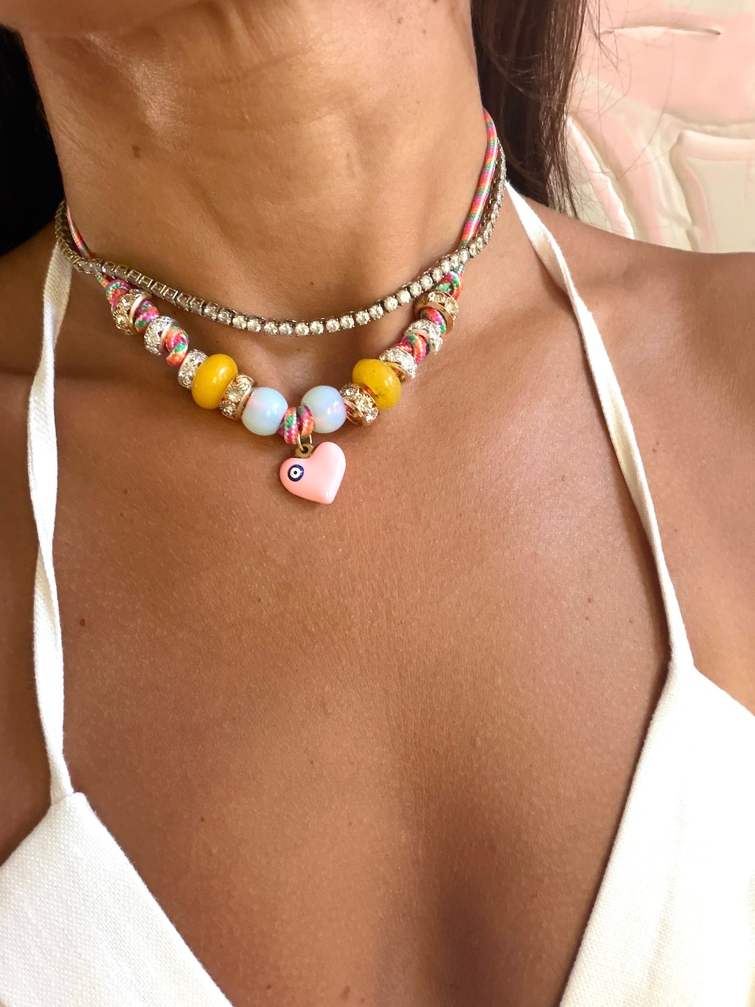 Handmade in our Melbourne studio from rainbow paracord, adjustable with a sliding toggle. Featuring a evil eye pnk heart charm, finished with agate, quartz, diamanté and metal beads. Bright, playful and full of light.