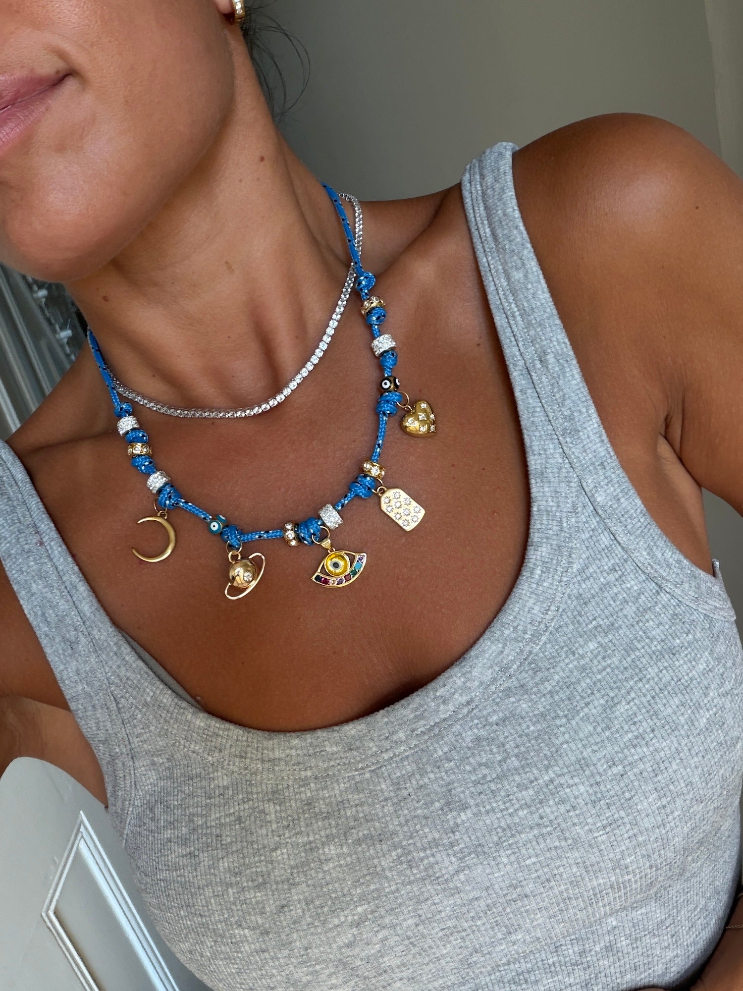 Handmade in our Melbourne studio from blue paracord, adjustable with a sliding toggle. Adorned with 5 luxe charms pendants including moon, planet, evil eye, dog tag, and heart, alongside evil eye, diamanté, and metal beads. Wear short or long.