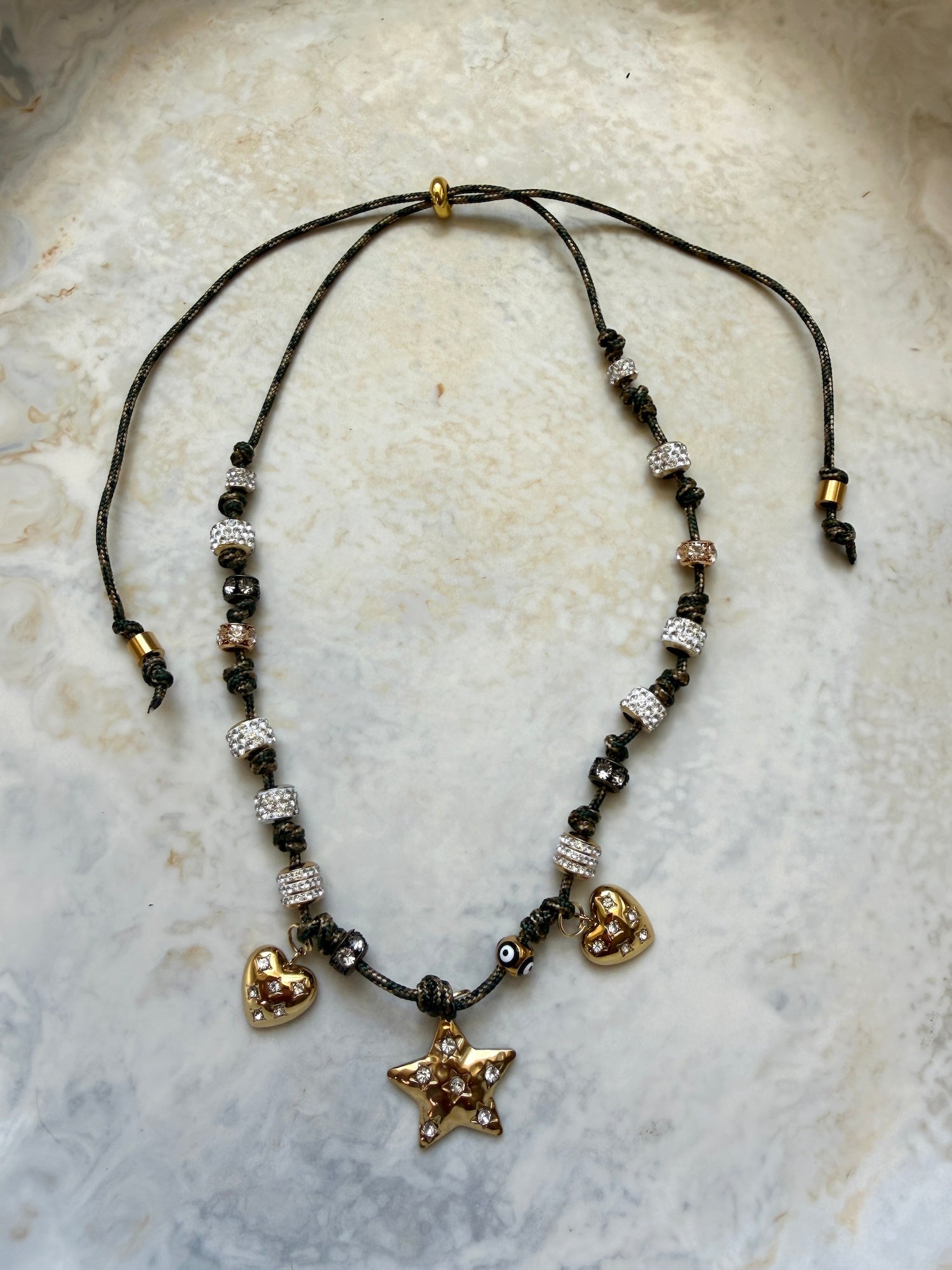 Handmade in our Melbourne studio from khaki paracord, adjustable with a sliding toggle. Adorned with three luxe gold heart charms and a diamanté star, finished with diamanté and metal beads. Soft, glowing and endlessly wearable.