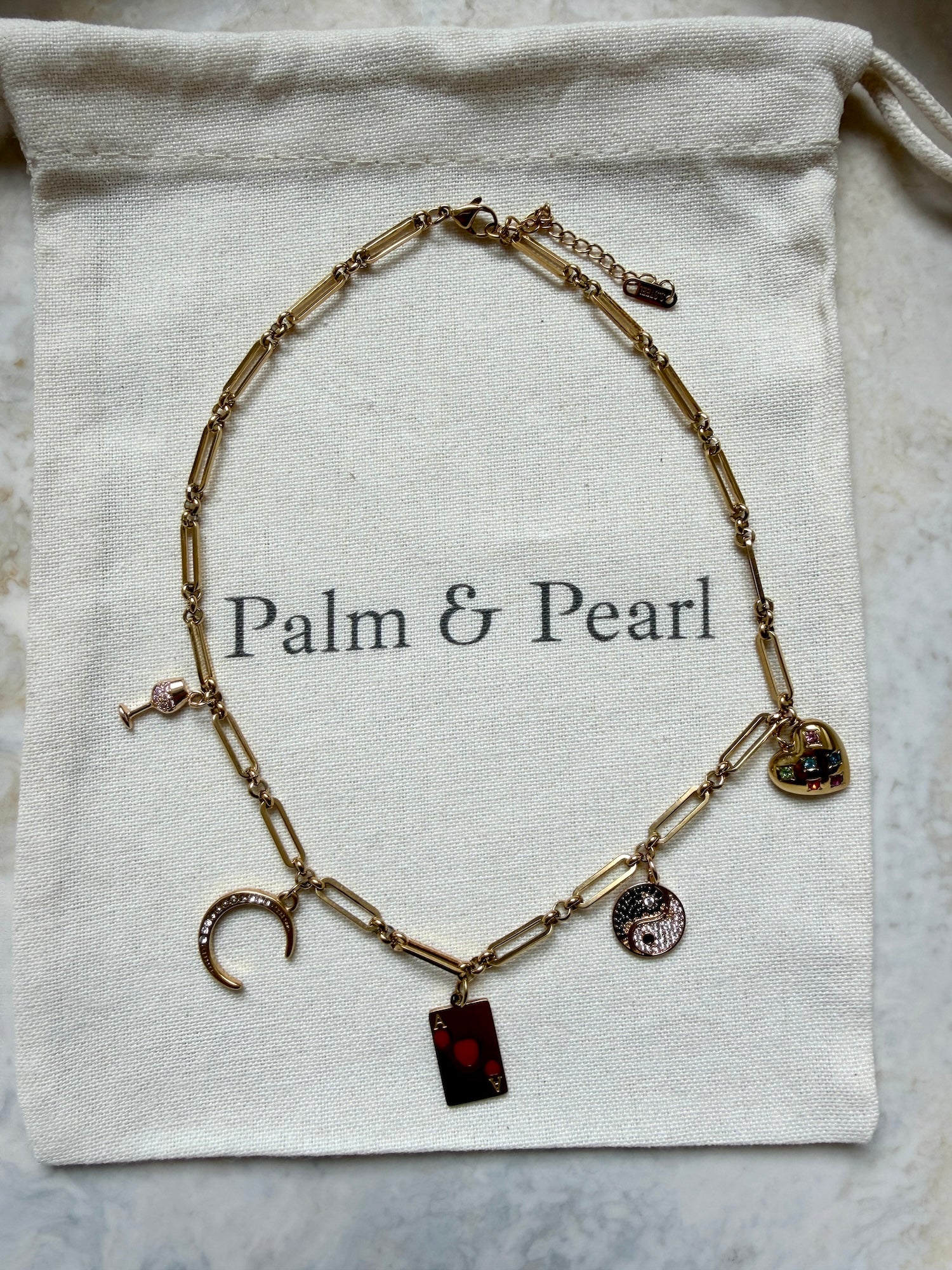 Designed on a gold-toned stainless steel paperclip chain, the Whisper Charm Necklace features five luxe charms including an ace of hearts, moon, yin yang, wine glass, and heart. Approx. 40cm.